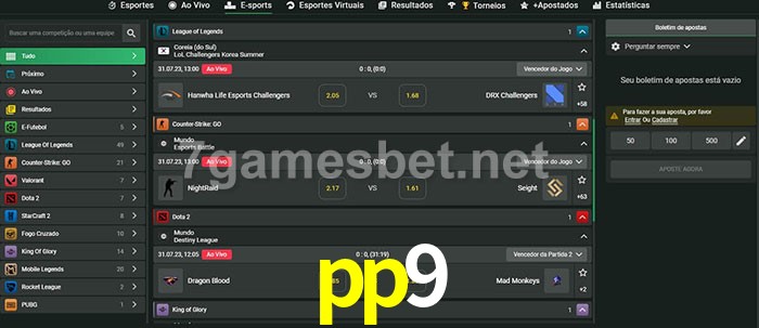 O pp9 oferece uma grande seleção de opções de apostas em e-sports com probabilidades competitivas